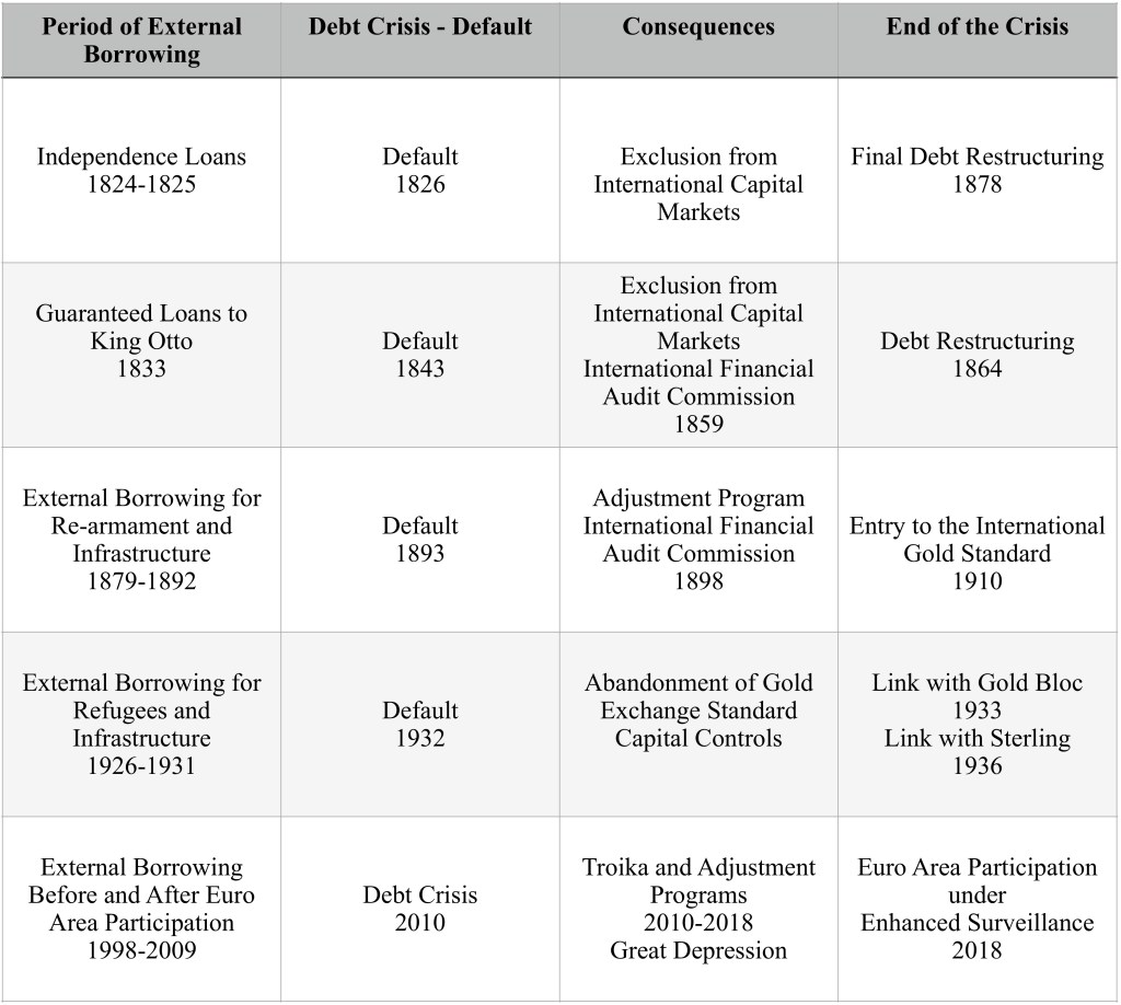 All of the above have happened in the periodic debt crises that have affected the Greek economy. The default of 1843 was followed by the naval blockade of Piraeus and the imposition of an International Financial Audit Commission (IFAC), which oversaw the gradual repayment of Greece’s restructured external debt. The default of 1893 was followed by the imposition of an even stricter supervision through an even more empowered International Financial Audit Commission (IFAC). In exchange for a new official loan to repay its old debts, the IFAC imposed a strict fiscal and monetary adjustment that, at least initially, resulted in a major economic downturn. The default of 1932 was accompanied by devaluation, fiscal adjustment, prolongation of the recession and imposition of controls on capital movements. The 2010 debt crisis was accompanied by formal borrowing to refinance external debt and the imposition of three successive adjustment programs, designed and overseen by a “troika” of representatives from the IMF, the European Commission and the ECB. Although it contributed to the significant correction of the external and fiscal imbalances that characterized the Greek economy, this policy caused a major economic depression, which lasted seven years, between 2010 and 2016.